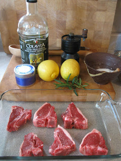 You'll need 2 lemons (one for the marinade, one for serving), 1/4 cup of good olive oil, and 3 tablespoons of Herbes de Provence (two for the marinade, and one for a sprinkle at the end). This is enough for 12 chops. I also added some fresh rosemary, since, well, common, lemons? olive oil? lamb? the grill? how could I not add some rosemary?!